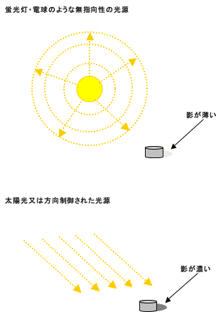 太陽光は完全な平行光で、蛍光灯や、電球は拡散型の光となっています。